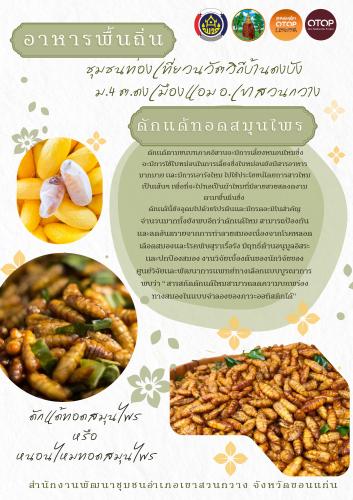 เมนู : ดักแด้ทอดสมุนไพร อาหารพื้นถิ่นชุมชนท่องเที่ยว OTOP นวัติวิถีบ้านดงบัง ตำบลดงเมืองแอม อำเภอเขาสวนกวาง